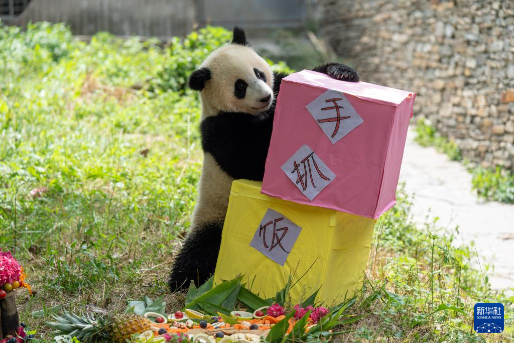 7月17日,大熊猫璨璨的幼崽在玩耍。