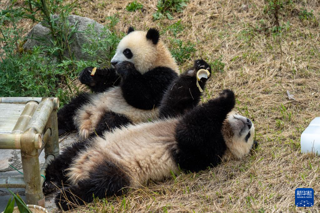 7月17日,大熊猫喜豆的幼崽仰躺着品尝美食。