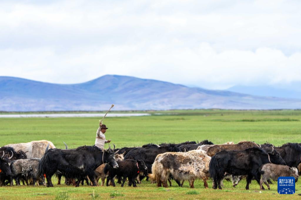7月22日拍摄的玛旁雍错湿地上的牦牛。