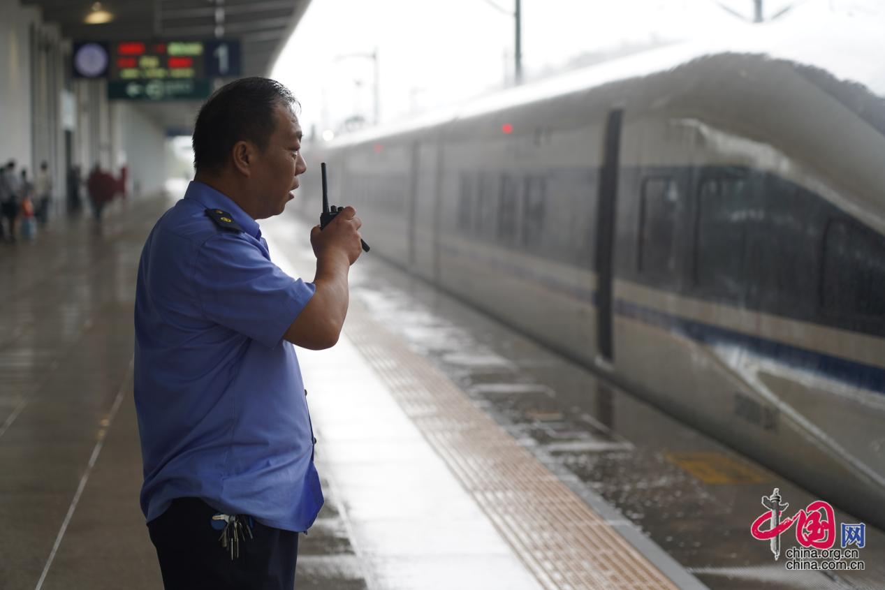 阳泉站站台客运员与车站联控作业。(郝奕星)