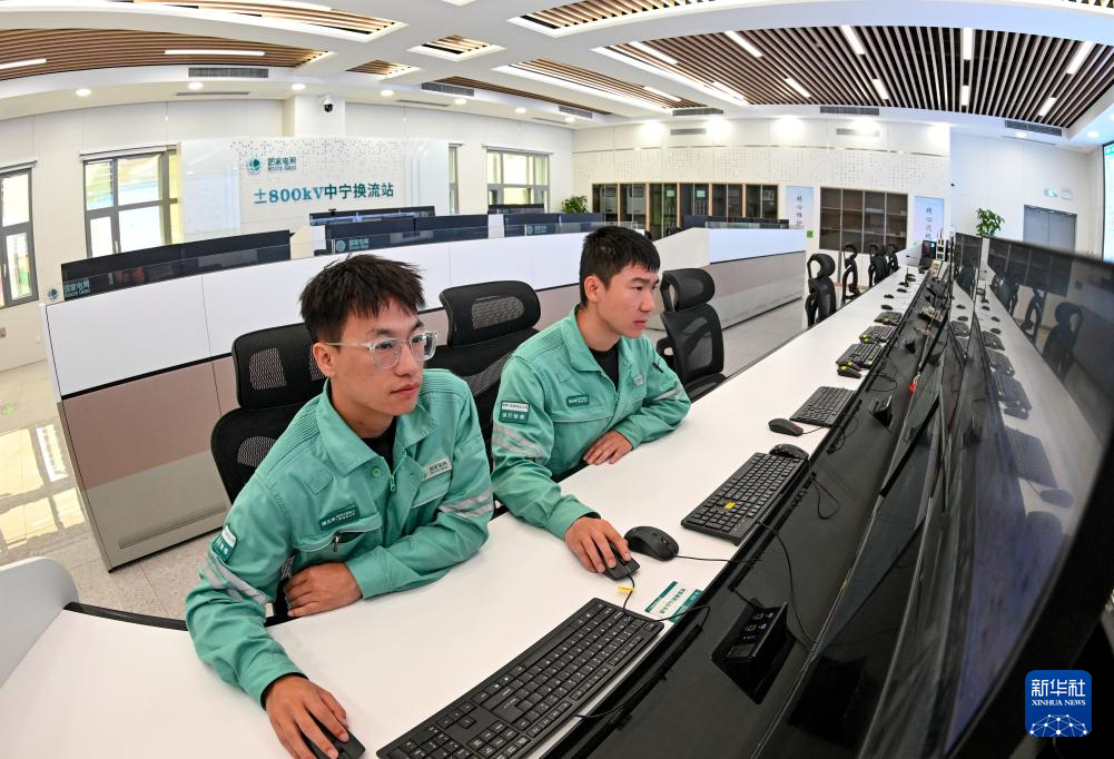 8月20日,在“宁电入湘”工程宁夏中卫市中宁换流站内,检修人员在主控室监控设备运行情况。