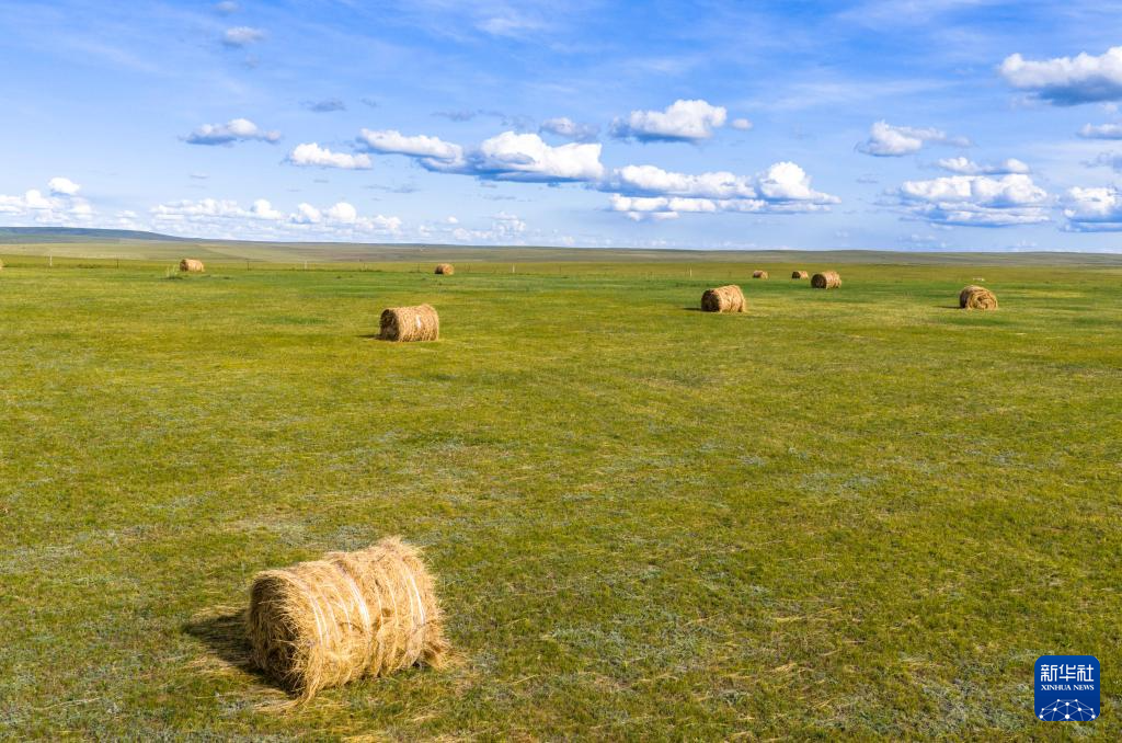 初秋时节,内蒙古呼伦贝尔大草原草色渐黄。在辽阔的草原上,牧民将丰收的牧草捆扎成卷,成群的牛羊、马匹漫步其间,勾勒出一幅祥和美丽的秋日丰收图景。