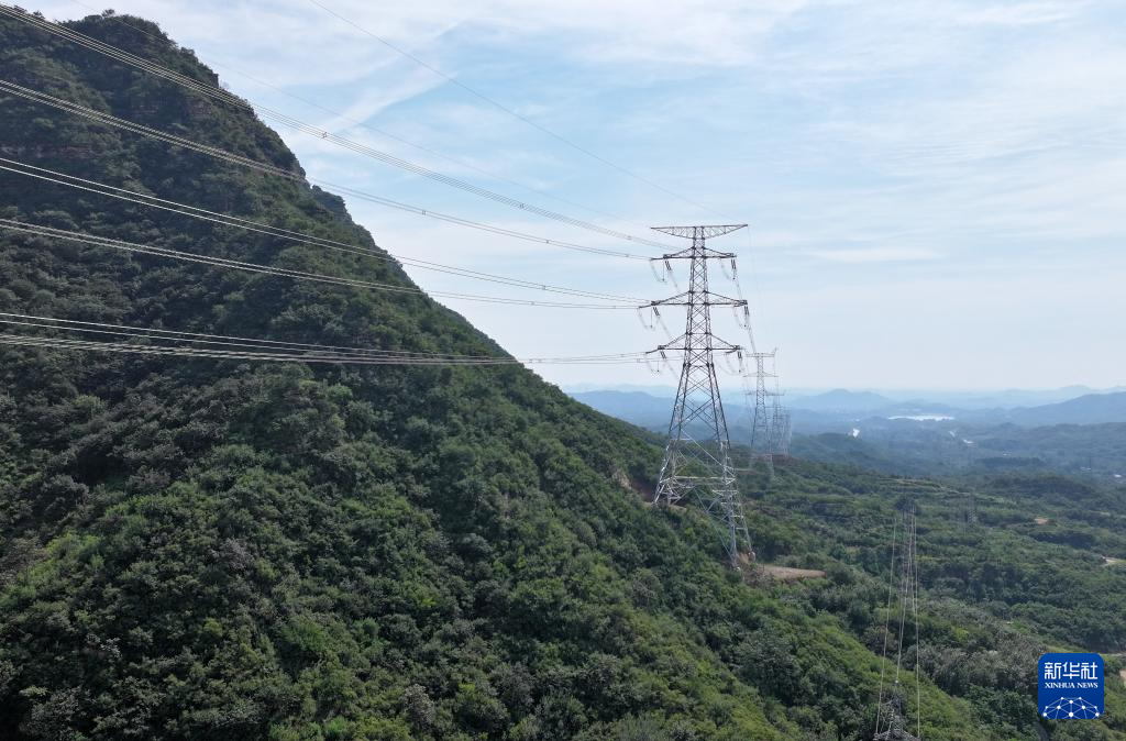 这是8月26日拍摄的河北省易县抽水蓄能电站下水库附近的电站送出线路(无人机照片)。
