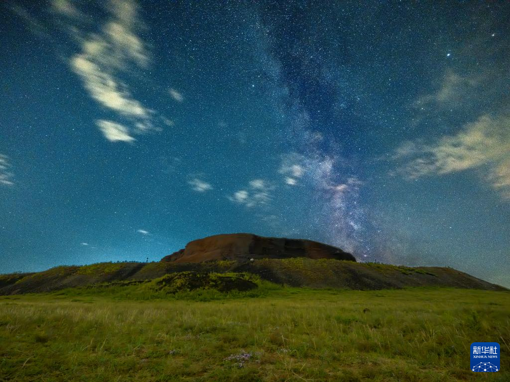 这是8月30日在内蒙古乌兰察布市察哈尔右翼后旗乌兰哈达火山地质公园内拍摄的银河下的6号火山与草原(堆栈合成照片)。