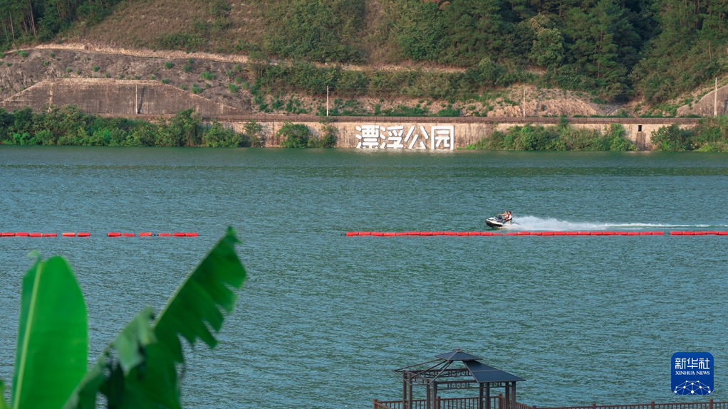 9月6日,游客在雄江镇漂浮公园体验水上摩托艇项目。
