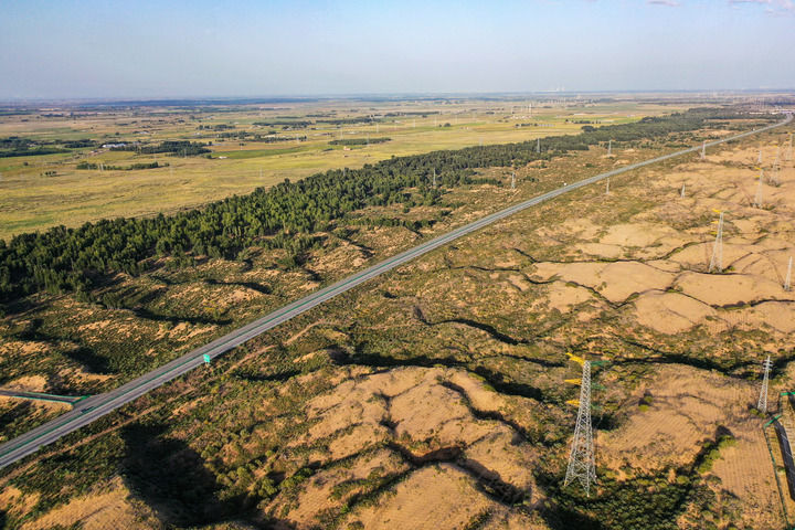 这是2025年9月10日拍摄的库布其沙漠北缘锁边林带(无人机照片)。新华社记者 李志鹏 摄
