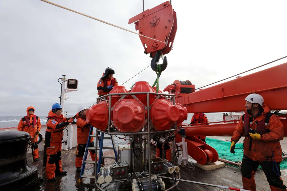 图为科考队员在北冰洋科考时回收Lander(生态海底着陆器)。新华社记者刘诗平 摄