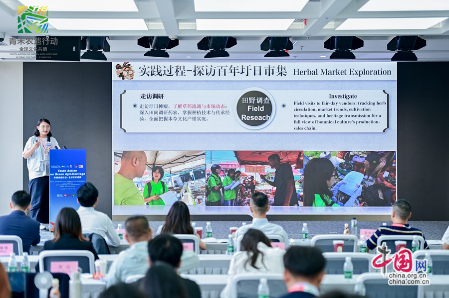 图为福建农林大学学生侯雨莹围绕中草药圩日市集分享农业文化遗产地的创新解决方案。