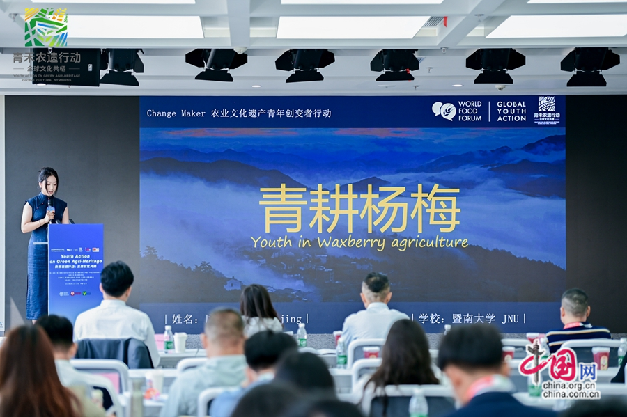 图为暨南大学学生顾诗静围绕仙居古杨梅群复合种养系统分享农业文化遗产地的创新解决方案。