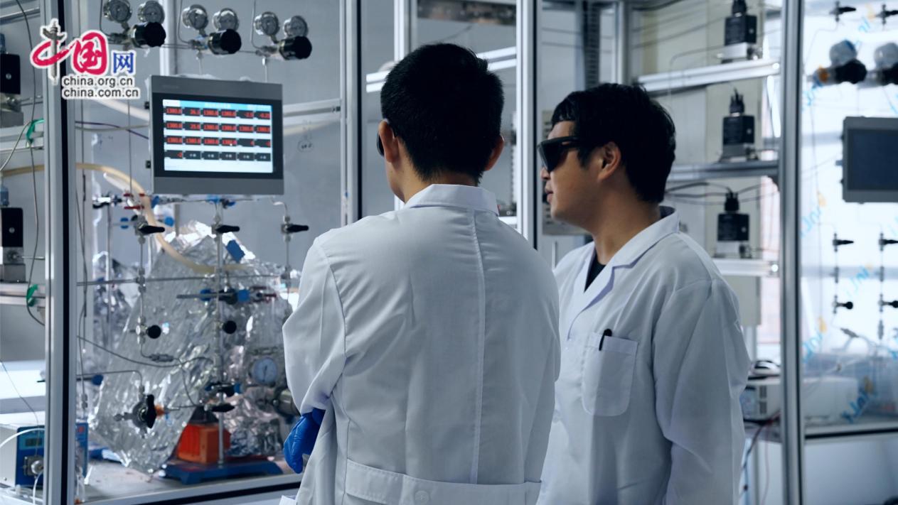 图为大连化物所科研人员在光催化固定床反应装置前讨论CO2转化为乙烷或乙烯实验反应流程。