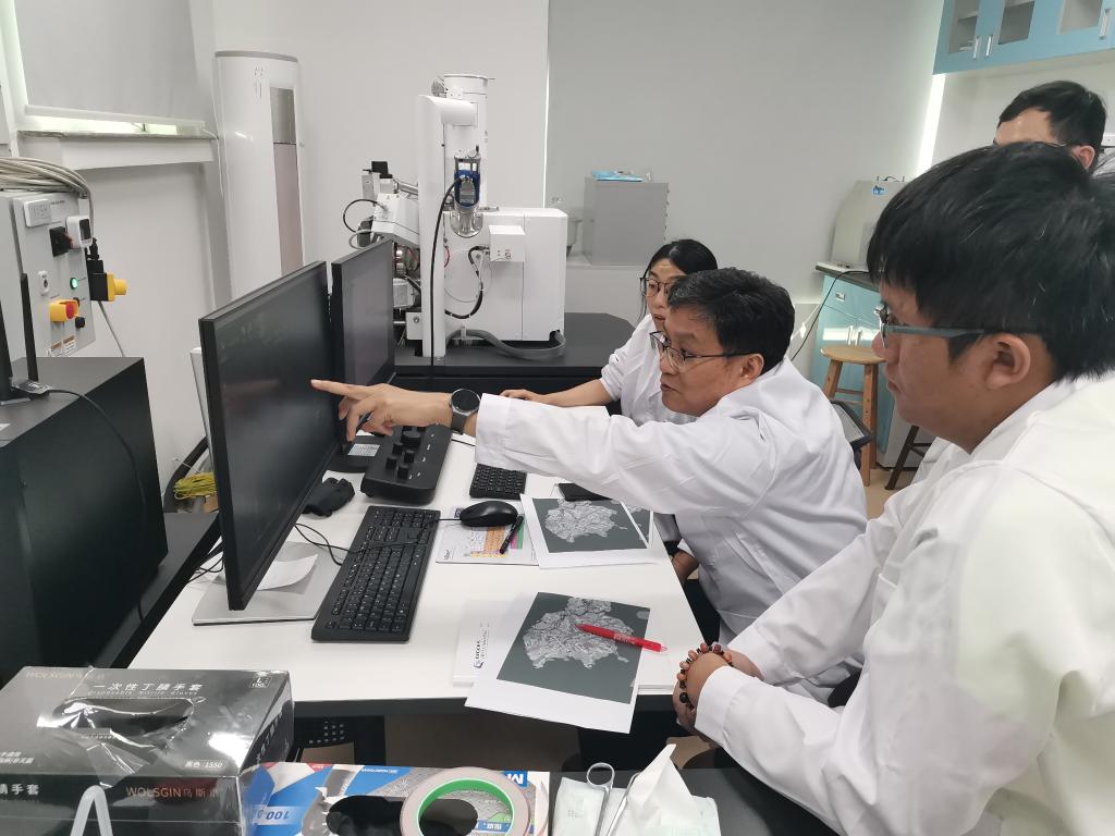 2024年8月26日,徐义刚院士与团队成员通过扫描电镜观察嫦娥六号样品特征。(中国科学院广州地球化学研究所供图)