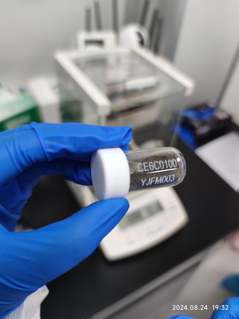 2024年8月24日,在中国科学院广州地球化学研究所实验室内拍摄的月壤样品。(中国科学院广州地球化学研究所供图)