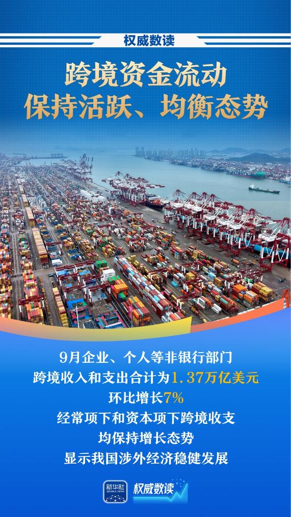 国家外汇管理局10月22日发布数据显示,9月企业、个人等非银行部门跨境收入和支出合计为1.37万亿美元,环比增长7%。经常项下和资本项下跨境收支均保持增长态势,显示我国涉外经济稳健发展。前三季度我国涉外收支总规模为11.6万亿美元,创历史同期新高。
