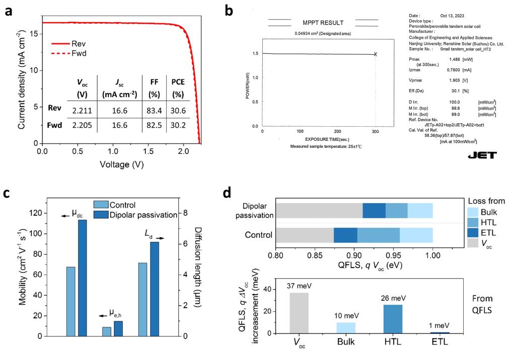此次研究中科研人员发现,钙钛矿吸光层和空穴传输层之间的界面,是载流子损耗较多的区域。团队为此设计出一种偶极钝化层,它就像城市里的单行道,一头连着钙钛矿吸光层,一头连着空穴传输层,驱使载流子向空穴传输层运动。