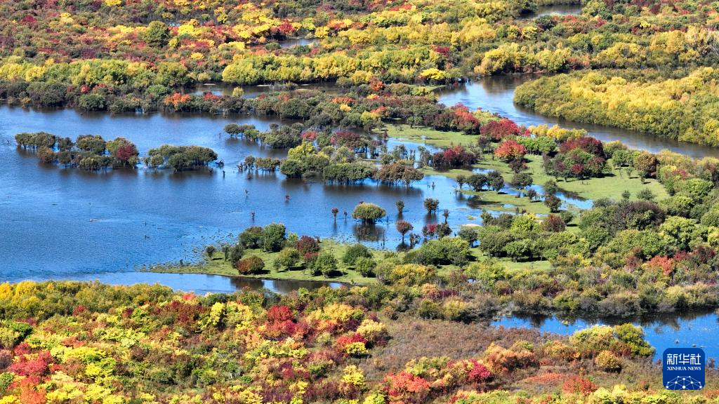 时下,内蒙古额尔古纳湿地迎来秋日盛景,多彩的灌木丛点缀其间,蜿蜒的河流如蓝丝带般静静流淌,宛若大自然打翻的调色盘。