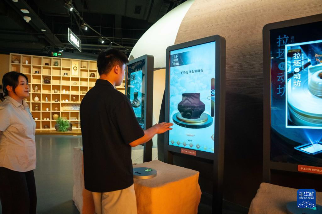 9月16日,在湖南省怀化市五溪非遗园,游客在体验数字化土陶制作。