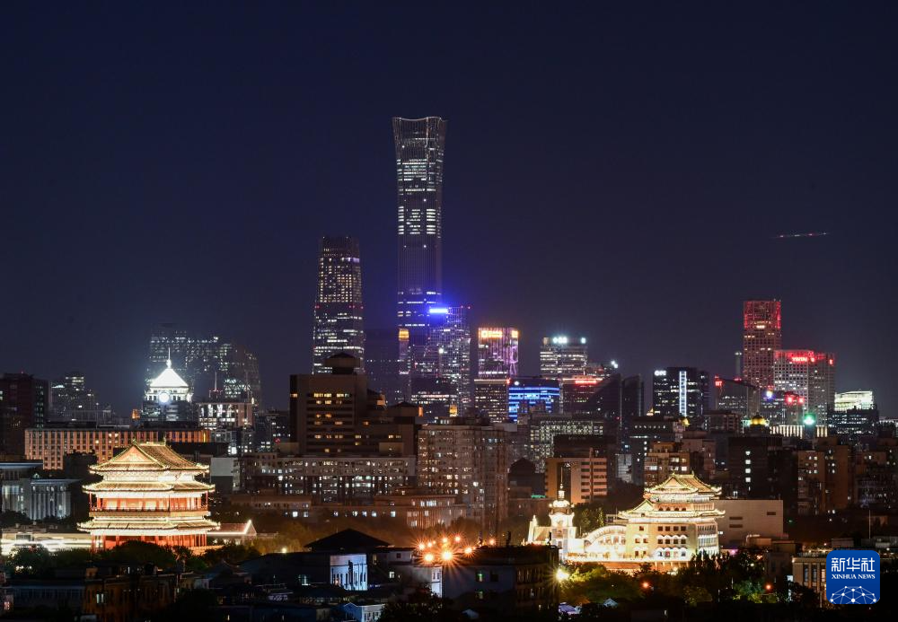 这是9月17日拍摄的北京正阳门城楼、正阳门箭楼和远处的CBD建筑群夜景。
