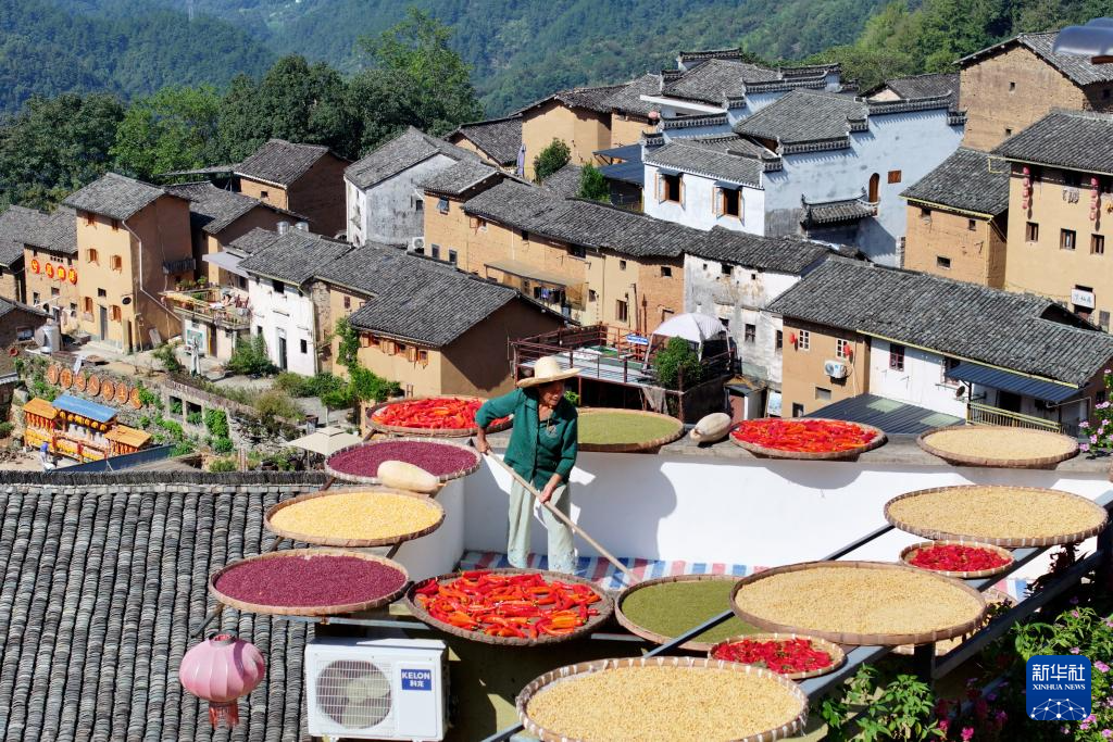 秋收时节,在安徽省黄山市歙县深渡镇阳产村,村民利用晴好天气,抓紧晾晒收获的辣椒、玉米、山核桃等农作物,描绘出一幅山村“晒秋”图。