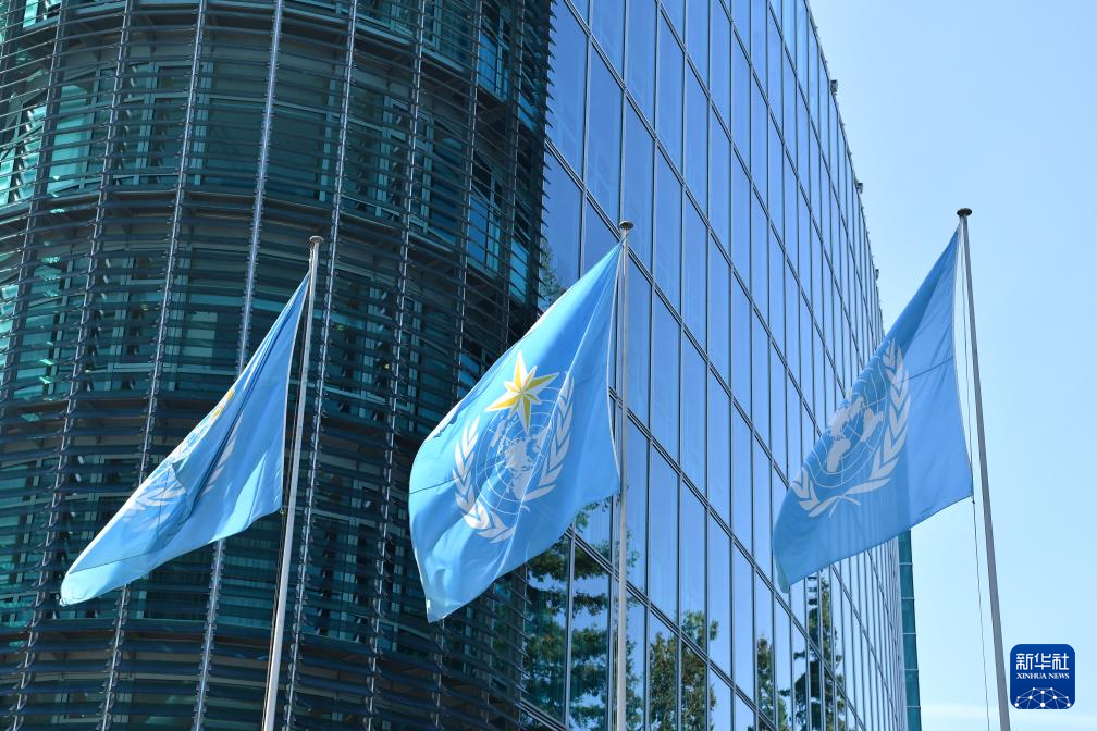 这是9月17日在瑞士日内瓦世界气象组织总部拍摄的世界气象组织旗帜。