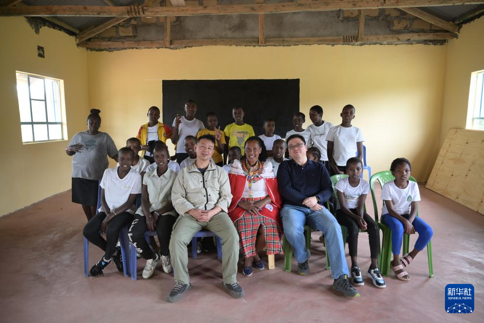 8月31日,在肯尼亚西南部纳罗克郡西纳罗克区艾通镇的女童救助中心新建的教室内,救助中心出资人汤麟(前排左三)、救助中心负责人玛丽·西兰托伊(前排中)和袁林(前排右三)与救助中心的女孩合影。