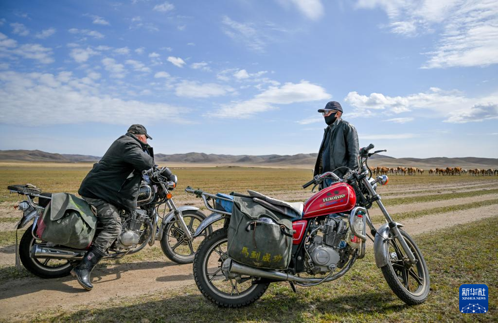 今年52岁的都楞宝力高是游牧转场的“老把式”。“以前都是骑马转场,现在是骑摩托和开车。以前在夏牧场只能搭蒙古包,现在基本都有固定板房,还有太阳能供电,照明、取暖和保存食物都很方便。”都楞宝力高说。