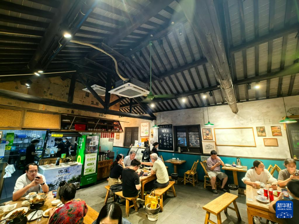 9月19日,人们在沈荡镇老街上的胜利饭店就餐。这家饭店曾在余华小说中提到过,吸引了各地游客前来打卡。