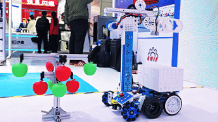 在第三届全国技能大赛广东省展演展示区,自主移动机器人在进行摘果操作演示。