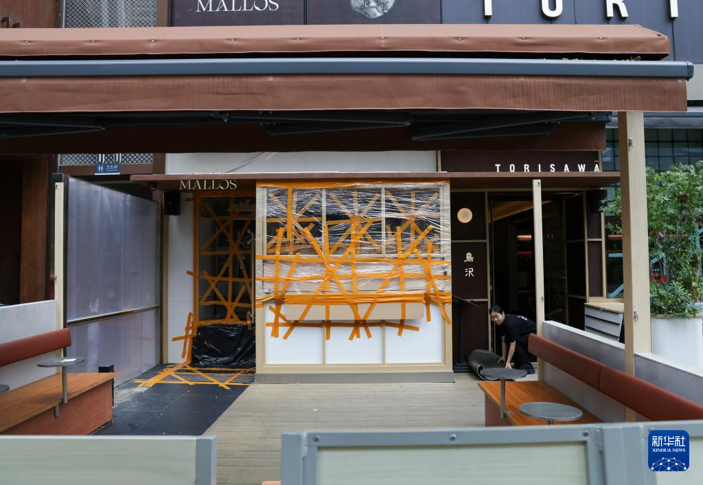 9月23日,在深圳市福田区一处商场,临街餐馆的服务员收拾室外物品。
