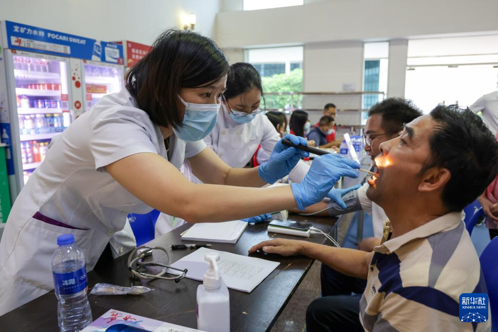 9月23日,在深圳大学粤海校区羽毛球馆,社区医务人员为避险群众进行身体检查。