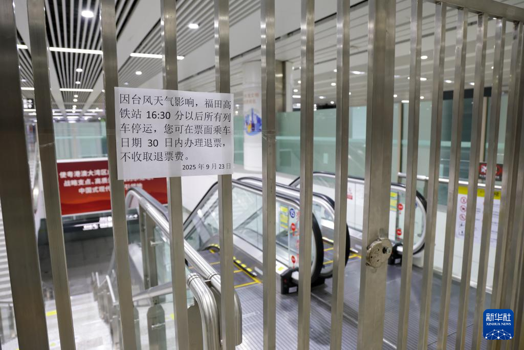 9月23日,深圳福田高铁站的进站闸门已关闭,门口张贴着因台风停运的告示。