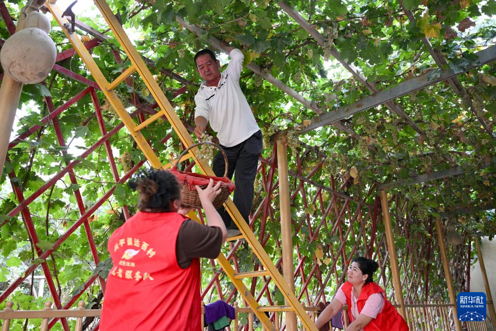 9月18日,达西村村干部入户帮助村民采摘葡萄。近年来,达西村充分挖掘房前屋后闲置土地及荒废地块,逐步扩大特色林果种植面积,引导村民增收。
