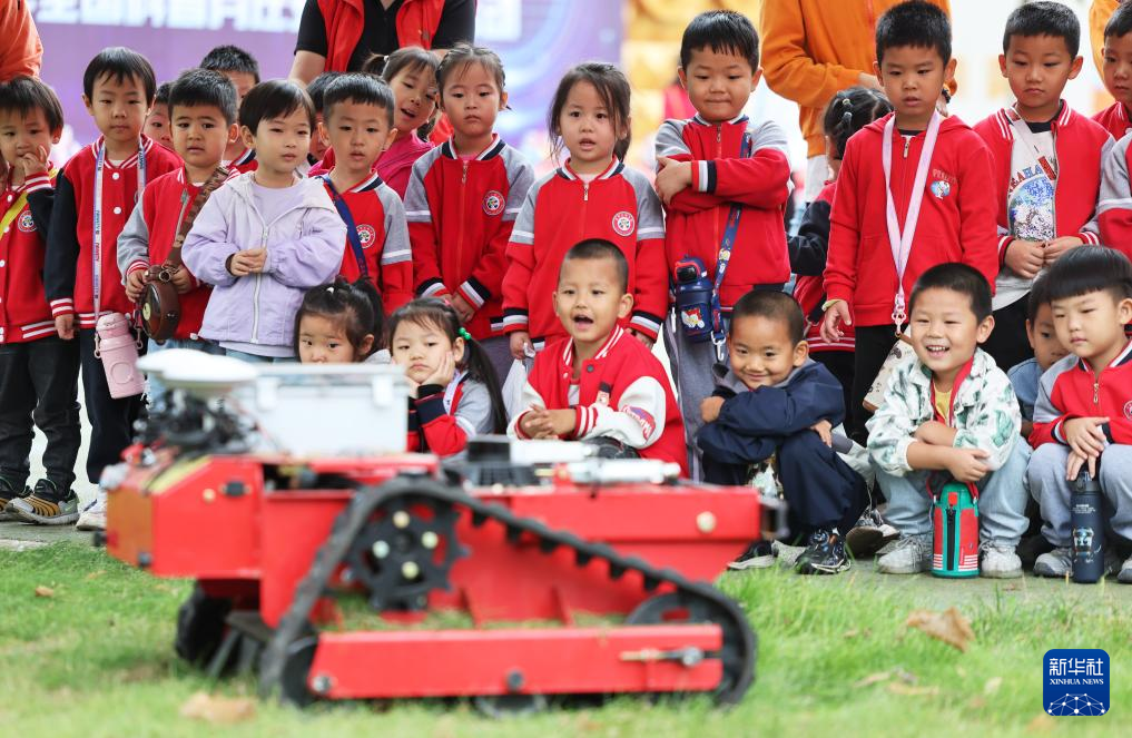 9月23日,河北省迁安市组织150余名幼儿园儿童来到亚滦湾农业公园开展研学活动。这是小朋友在亚滦湾农业公园观看割草机器人作业。