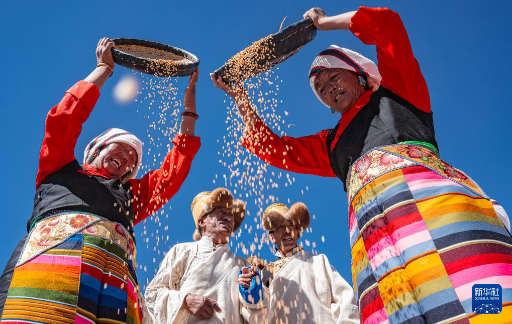 9月23日,在西藏拉萨市林周县强嘎乡典冲村,当地农民用传统方式让青稞脱粒。