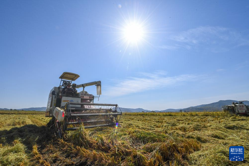 9月23日,在吉林省吉林市永吉县岔路河镇,永吉县鑫丰种植农民专业合作社农民驾驶农机收割水稻。