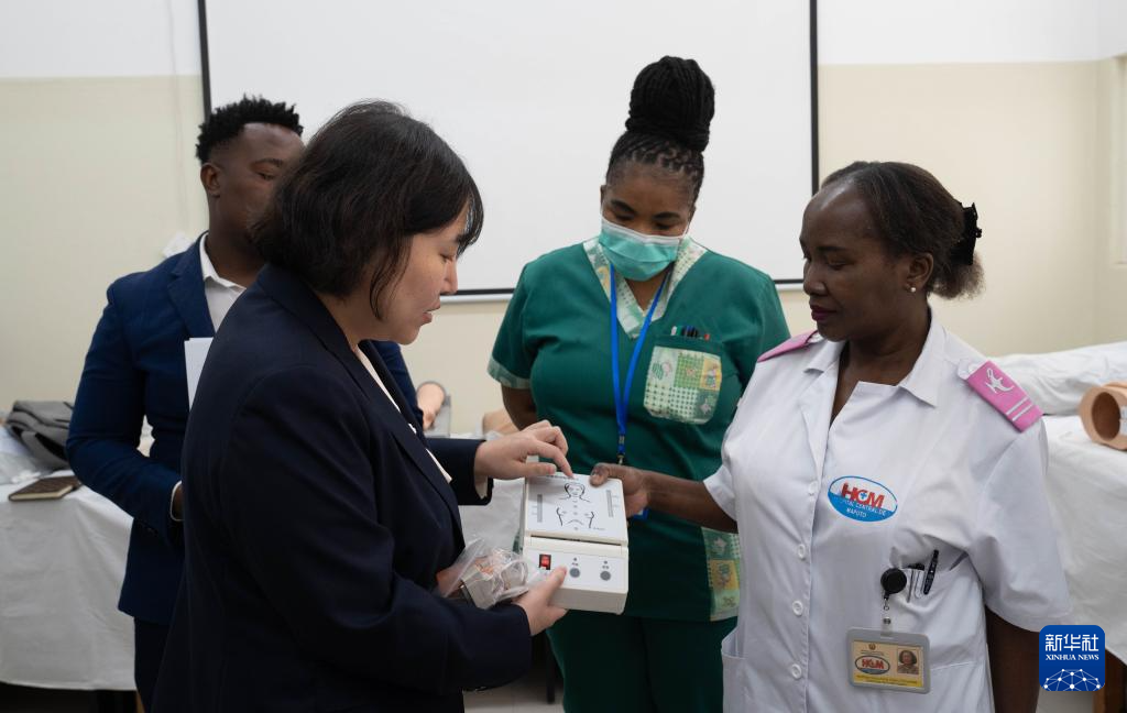 9月24日,四川大学华西医院医生(前左)向莫桑比克马普托中心医院护士讲解捐赠的医疗设备使用方法。