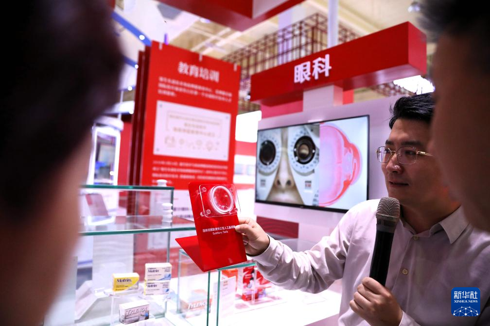 9月24日,工作人员为参观者介绍“连续视程散光矫正型人工晶状体”。