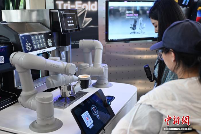 9月24日,咖啡机器人现场调制咖啡。当日,购在中国·2025数字消费嘉年华暨杭州数字贸易时尚消费周,在浙江杭州西湖畔的上城湖滨路步行街启动。不少数智时尚消费产品和业态在此亮相,吸引民众体验。中新社记者 王刚 摄