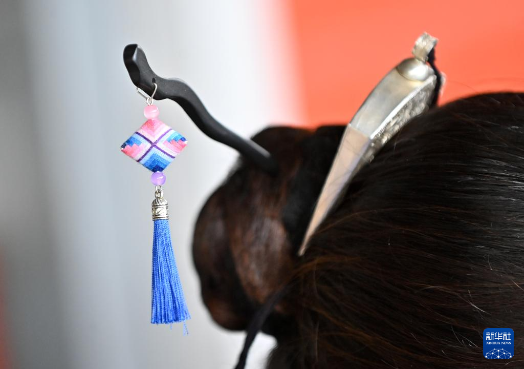 9月24日,在广西三江侗族自治县八江镇三团村,当地村民佩戴侗族吉祥花头饰。