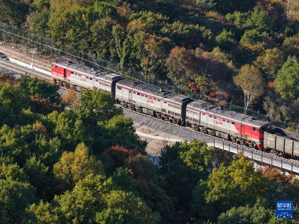 9月27日,满载大宗品类货物的入境列车在滨绥铁路绥芬河至国境线提质改造工程新线路上行驶(无人机照片)。