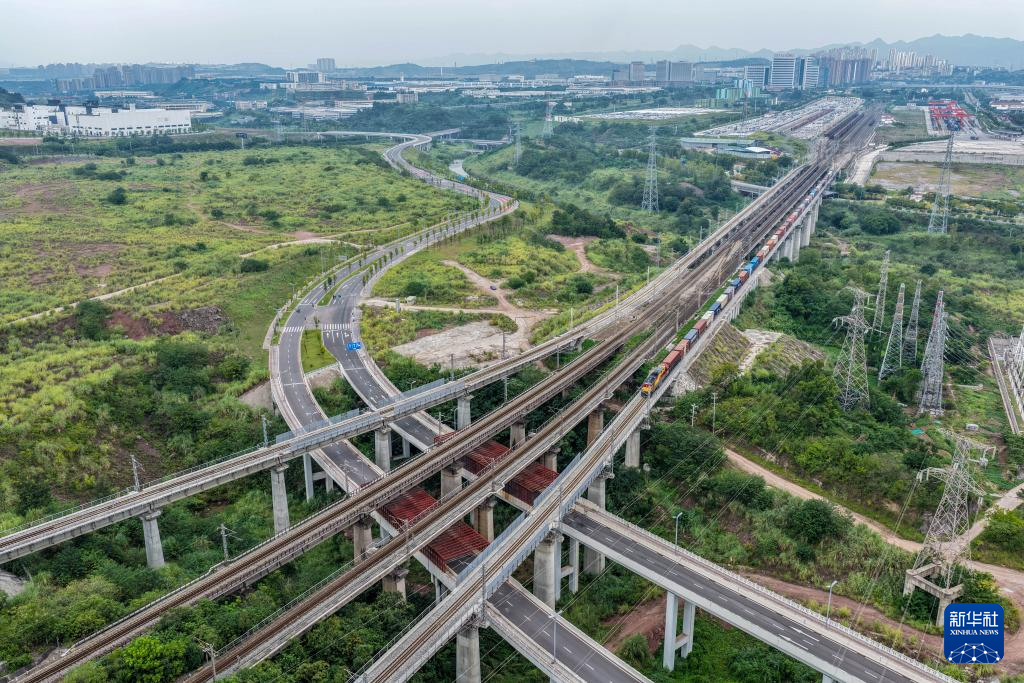 9月28日,西部陆海新通道班列在重庆鱼嘴站顺利发车(无人机照片)。