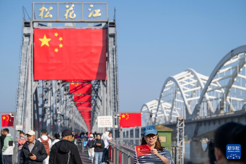 10月1日,游客在哈尔滨市滨州铁路桥上游览(无人机照片)。