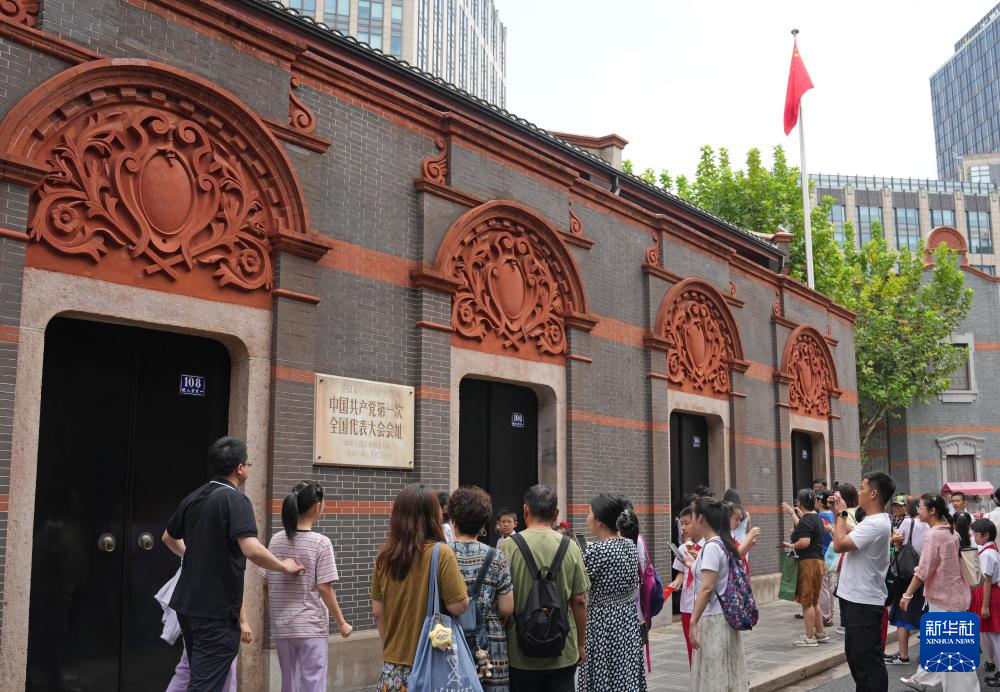 10月1日,在上海中共一大纪念馆,一名小女孩坐在爸爸的肩膀上观看升旗。