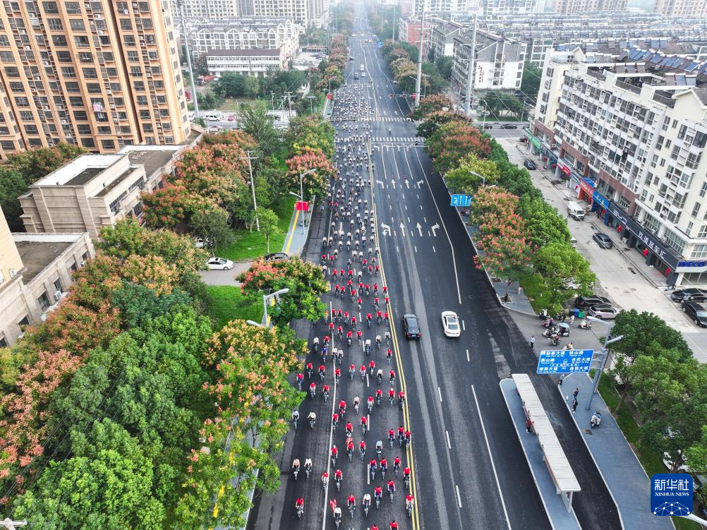 10月1日,江苏省淮安市盱眙县举行“共贺祖国华诞”绿色骑行活动(无人机照片)。