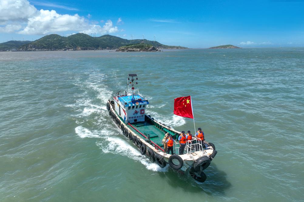 10月1日,浙江省舟山市岱山县公安局罗家岙派出所民警开展海上巡查(无人机照片)。新华社发(邹训永摄)