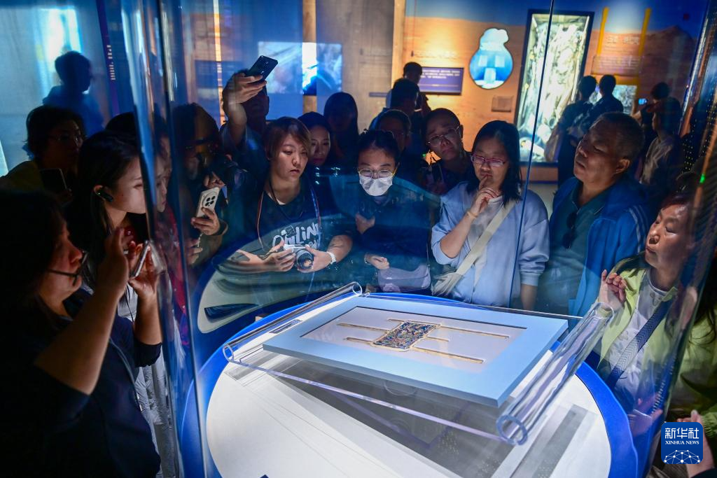 10月2日,游客在新疆维吾尔自治区博物馆参观镇馆之宝——“五星出东方利中国”锦护臂。