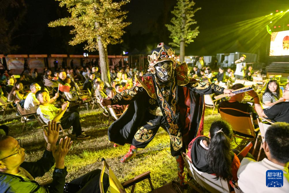 10月1日晚,在四川成都新都高新技术产业园区沐光森林营地,川剧变脸演员在“成都新都区第二届银杏林下音乐嘉年华”活动中表演变脸。