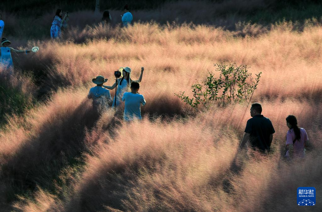 10月2日,游客在浙江省台州市温岭植物园粉黛乱子草花海中赏景拍照。