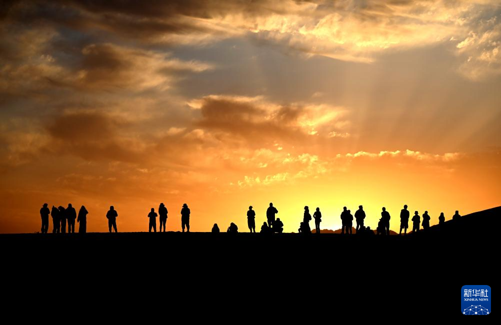 10月2日清晨,游客在甘肃省敦煌市鸣沙山月牙泉景区观赏大漠日出美景。