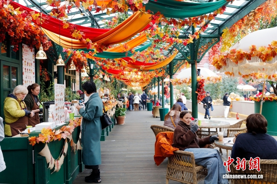 当地时间10月8日,游客在俄罗斯首都莫斯科市中心的马涅什广场小憩。“俄罗斯季节”——金秋美食文化节正在此间举行,人们可以在由上千形状大小各异的南瓜和菊花、干草等营造出的秋天氛围中品尝各种俄罗斯美食,欣赏音乐表演。