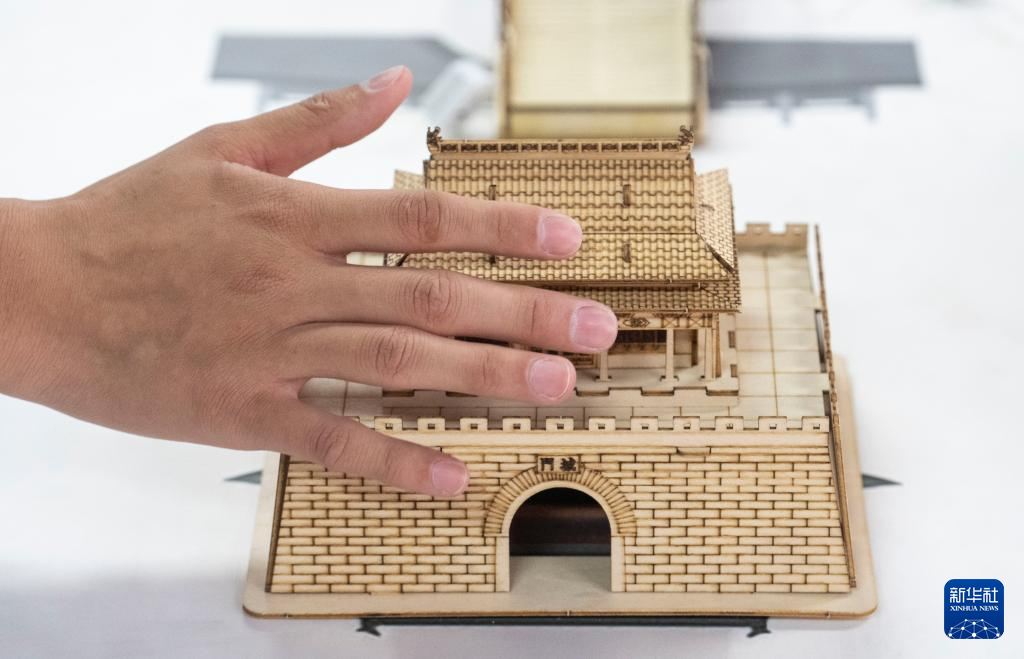10月13日,视障人士在发布会后,触摸北京中轴线建筑模型。